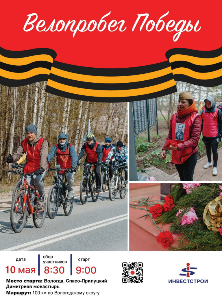 Жителей и сотрудников компании приглашают присоединиться к традиционному велопробегу, посвященному 81-й годовщине Победы в Великой Отечественной войне. Мероприятие состоится 10 мая 2026 года, сбор участников — в 09:00 у стен Спасо-Прилуцкого Димитриева монастыря. Маршрут протяженностью около 100 километров пройдет через населенные пункты Вологодского округа. Участники велопробега сделают остановки у памятников героям Великой Отечественной войны, чтобы возложить цветы и почтить память солдат, сражавшихся на поле боя, трудившихся в госпиталях и ковавших победу в тылу. «Велопробег — это еще один способ выразить бесконечную благодарность поколению победителей. Мы помним их подвиг и чтим традиции», — отмечают организаторы. В пути колонну будет сопровождать группа обеспечения с полевой кухней. Организационный сбор составляет 1000 рублей. Для участия необходимо зарегистрироваться — отсканируйте QR-код. Ждем всех, кто хочет сказать «спасибо» героям на языке спорта и единства.
